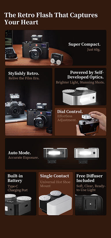 At just 55×47×36mm, it fits any scene: street photography, outdoor portraits, or indoor lighting.