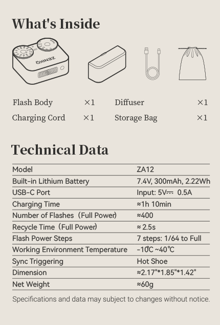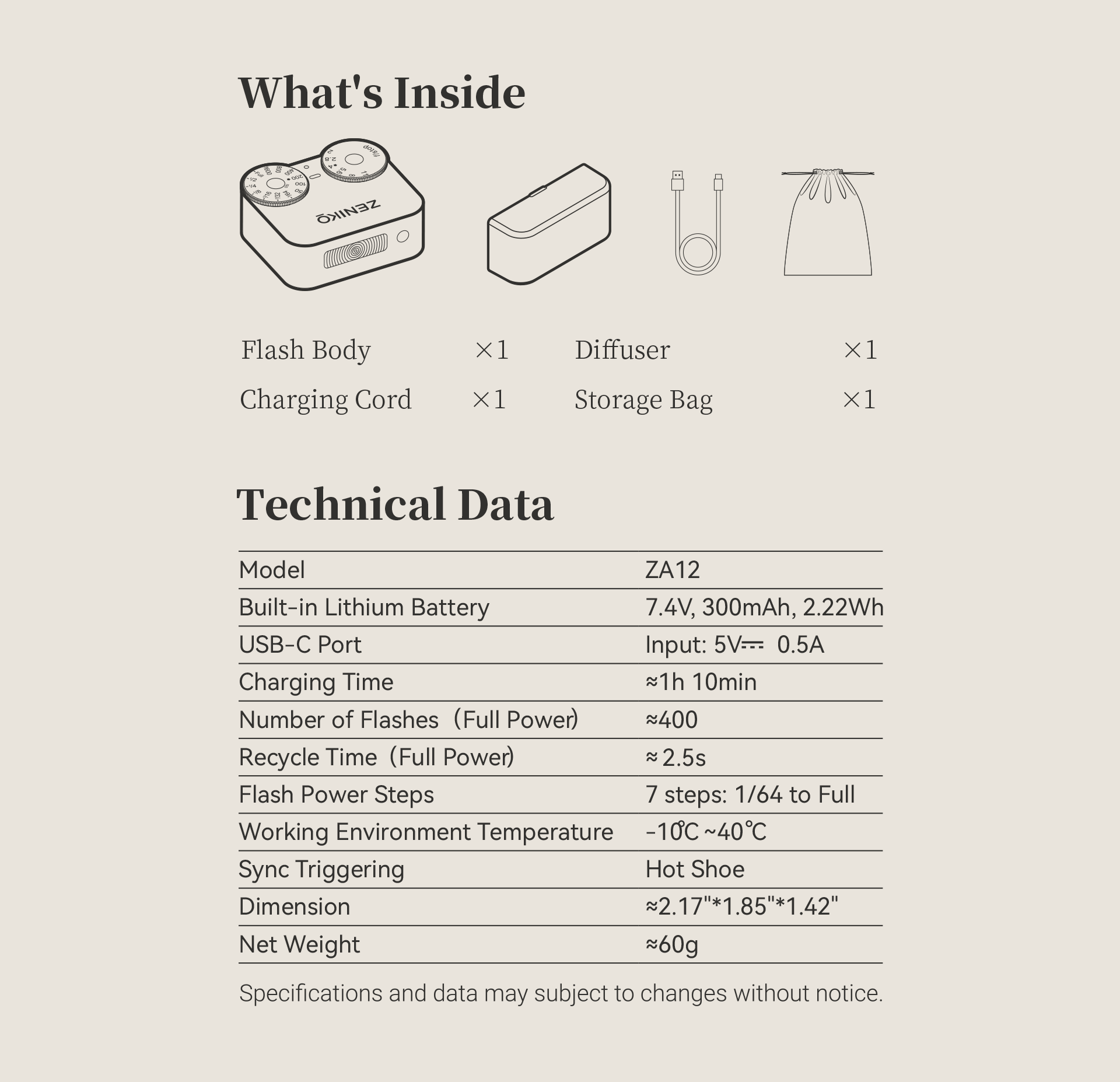 Despite its compact size, ZA12 delivers outstanding brightness with ZENIKO’s exclusive optical technology — a xenon tube paired with a Fresnel lens for powerful, even light output.